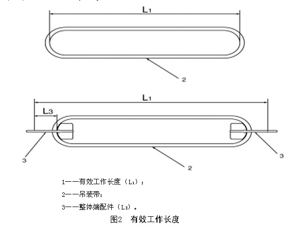 吊裝帶水平放置,并用手拉直時,用分度值為1mm的鋼卷尺或鋼直尺測量,其有效工作長度(EWL)L1(如圖2所示)偏差不應超過名義長度的±2%。