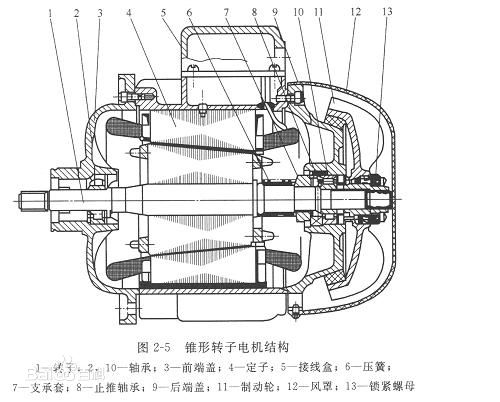 錐形轉子電動機的制動裝置由套在電機轉子上的制動彈簧、風扇制動輪和端蓋上的制動環組成。電動機運行時,錐形轉子電動機的氣隙磁場產生軸向磁拉力,壓縮制動彈簧,使風扇制動輪與電機端蓋上的制動環脫開,電機能自由轉動。斷電時,軸向磁拉力消失,轉子在制動彈簧的推力下產生軸向移動,使風扇制動輪壓緊制動環,產生摩擦力,迫使電機迅速停轉并綁住轉子,以防止起吊的重物下落,保障安全。