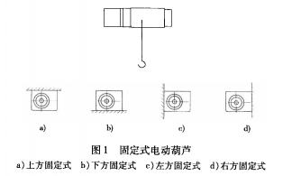 (1)固定式無運行機構、固定使用的電動葫蘆,按其安裝方式不同(即座腳在上、下、左、右位置的不同)可分圖1所示四種類型。