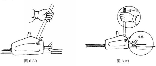 ⑧鋼絲繩固定端,必須確認(rèn)其穩(wěn)定程度或強(qiáng)度,為此,在扳動前進(jìn)桿使被牽引物體剛剛受力時(shí)要一度停止扳動,觀察固定端及鋼絲繩有無異常,確認(rèn)無異常后方可繼續(xù)操作,如圖6.31所示。