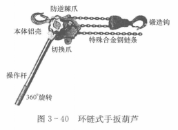 1、環(huán)鏈?zhǔn)绞职夂J(見圖3-40)。靠扳動手柄,通過傳動機構(gòu)帶動起重鏈條升降重物。環(huán)鏈?zhǔn)绞植话埠J是設(shè)備安裝,貨物起吊、物體固定、綁扎和牽引的理想工具,尤其是任意角度的牽引和在場地狹小,露天作業(yè)及無電源的情況下,更顯示其優(yōu)越性。