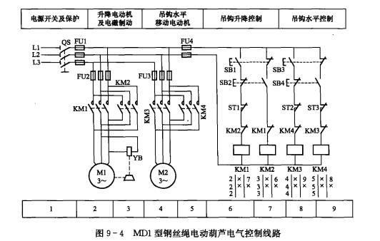 MD1型鋼絲繩電動葫蘆是一種輕小型起重設備。它可以飯莊在葫蘆單梁、橋式起重機、門式起重機、懸掛起重機等機械上,實現精密裝卸、砂箱合模、機床檢修等精細作業。MD1型鋼絲繩電動葫蘆電氣控制線路如圖9-4所示。