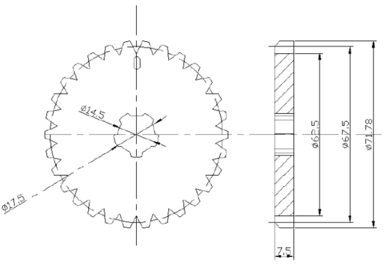 根據(jù)葫蘆傳動(dòng)齒輪低速重載,根據(jù)手拉葫蘆傳動(dòng)結(jié)構(gòu)的原理由五尺長軸的小齒輪帶動(dòng)片齒輪甲、乙,考慮到五尺長軸的小齒輪齒數(shù)甚小等特點(diǎn),1.5型葫蘆選用了齒形角20°的漸開線特種片齒輪變位齒輪,其基本齒形的基本參數(shù)如圖所示。選用齒形是考慮了以下因素:1.5t葫蘆傳動(dòng)齒輪的小齒輪齒數(shù)甚少為了避免根切和增強(qiáng)度,只能用正變位切削這樣小齒輪的外圓就受齒條的正切力,片齒輪與短軸屬于過硬配合,片齒輪的中心要設(shè)計(jì)出與短軸尺寸屬于硬配合的小花鍵孔尺寸如圖所示: