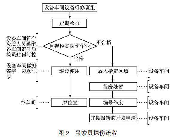 由設(shè)備車間定期進(jìn)行檢查檢測(cè),經(jīng)過探傷后合格的吊索具交由原車間繼續(xù)使用,并做好相關(guān)視頻和紙質(zhì)記錄;對(duì)檢測(cè)不合格的,要放入指定區(qū)域,集中報(bào)廢處置并做好記錄,同時(shí)啟動(dòng)新購流程