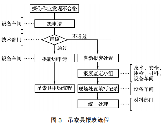 當探傷發現有不合格吊索具時,由設備車間提報報廢申請,報技術部門審核,通過后設備車間組織報廢鑒定小組進行現場處置并填寫臺賬記錄,同時由材料部門處置并新購。