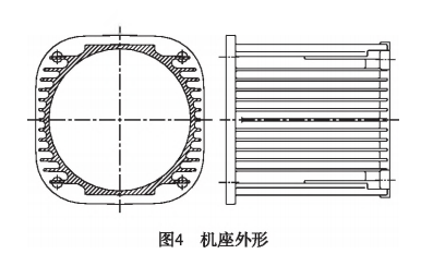 機(jī)座外形如圖4所示。取消上部葉片以滿足定子外徑的需要,下部葉片也相應(yīng)取消,一方面是為了對稱設(shè)計(jì),減少機(jī)座變形,同時也是美觀的需要;另一方面,下部機(jī)座外形平整,便于電機(jī)運(yùn)輸、裝配和維護(hù)等。兩側(cè)葉片采用水平方向葉片,外形協(xié)調(diào)美觀。機(jī)座采用鋁合金壓鑄件,壓鑄件尺寸精度較高,一般為IT5-IT7,可以減少毛坯的加工余量,減少切削工作量;鋁合金材料利用率高,既節(jié)約材料又節(jié)省加工工時;壓鑄件表面粗糙度小,一般可達(dá)到3.2-0.8,有良好的外觀質(zhì)量;壓鑄件抗拉強(qiáng)度高;壓鑄件質(zhì)量穩(wěn)定,可滿足大批量生產(chǎn)。
