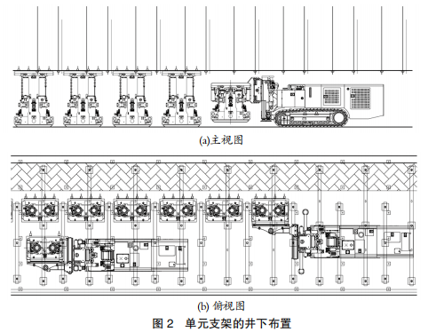 在沿空留巷工作面,單元支架通常布置在工作面后部,可以給脫模后墻體提供臨時保護,能夠保證在墻體凝固到一定強度前不承接頂板壓力。為防止反復撐頂破壞頂板,單元支架的移動采用無反復支撐的方式。撤除時,采用專用搬運車將最后面的支架移至最前面,保證留巷頂板完好。單元支架在井下工作面的布置如圖 2 所示。