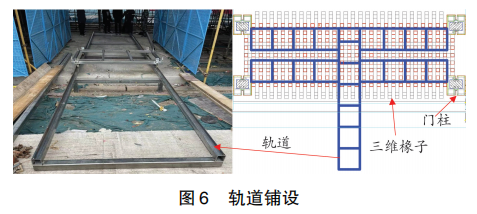 (1) 軌道鋪設(shè):如圖6所示,整體軌道為“干”字型,軌道用30mm×30mm×3mm方管縱橫向焊接,橫桿在下、縱桿在上,為防止脫軌,在縱向邊緣用5mm×5mm×2mm小方管焊制防脫軌擋板,在高低跨處焊接支腿支撐,為了便于沿屋面X方向移動,在屋面下方焊接X向軌道,由Y向軌道運(yùn)輸至屋面下方,垂直方向調(diào)換位置進(jìn)行運(yùn)輸。
